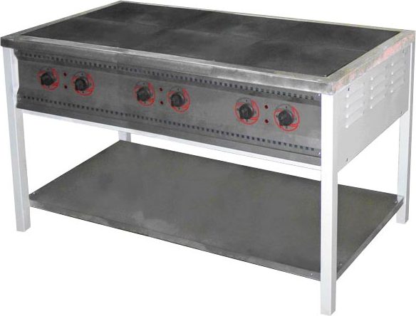 Плита предназначена для приготовления первых, вторых и третьих блюд в наплитой посуде. Используется на предприятиях общественного питания самостоятельно или в составе технилогических линий. Чугунные конфорки в качестве нагревательных элементов оснащены двумя ТЭНами, что обеспечивает быстрый и равномерный нагрев, а также гарантирует долгий срок эксплуатации конфорок. Площадь конфорок - 0,72 кв.м. Конфорки образуют ровную поверхность, что обеспечивает удобное и легкое перемещение наплитной посуды. Внизу окрашенные подставка с полкой, изготовленные из черного металла. Плита имеет регулируемые по высоте ножки